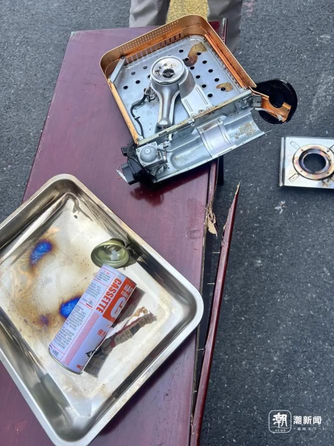 在加热过程中,铁板被炸飞了大约3米高,卡式炉被炸得四分五裂,桌子也被炸毁了一角。