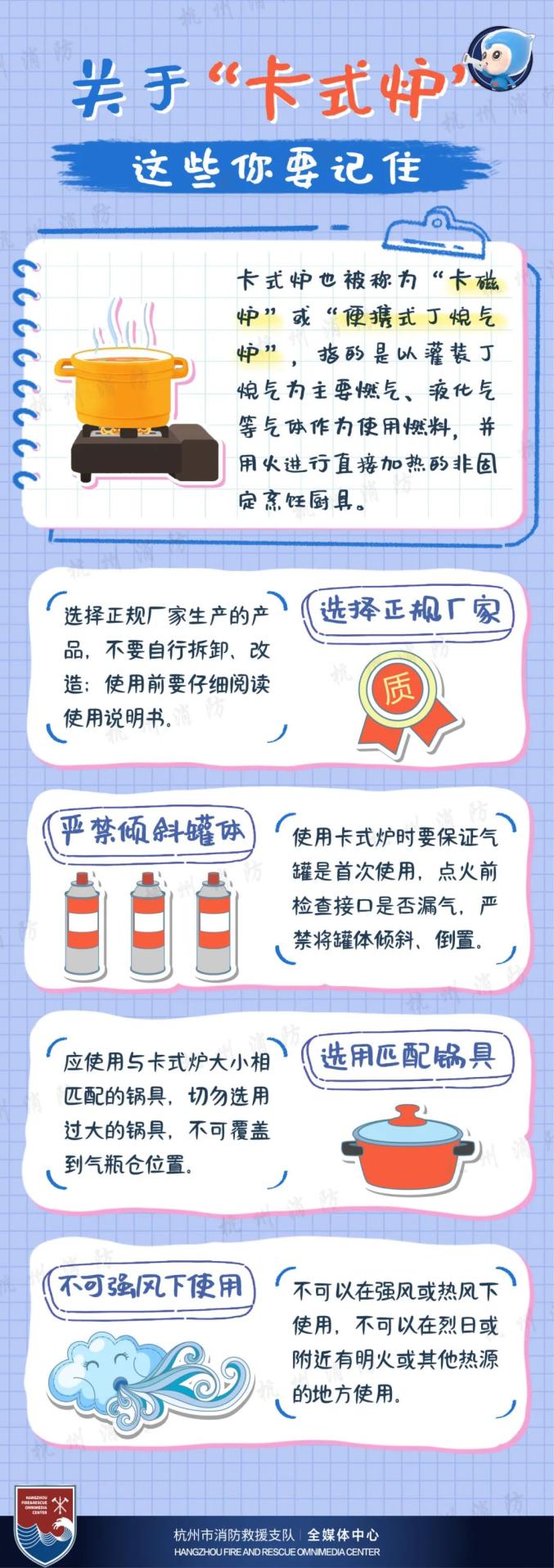 购买卡式炉和丁烷气罐时,应购买正规厂家的合格产品;使用卡式炉前,必须检查气罐是否漏气,卡式炉的点火系统和保护装置是否能正常工作。使用卡式炉时,不要使用底部超过炉体大小甚至覆盖气罐仓的锅,也不要将多个卡式炉并列使用。