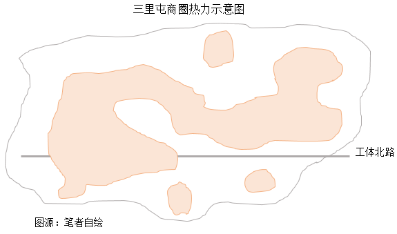 按照这个思路讨论商圈,很多所谓的商圈定义都是不准确的。两三个不相关的商业设施散落在相邻街道三四公里的位置,各行其是。所谓的商圈只是一种形象描述。还有比较理想的商圈图景,比如,三里屯商圈就是值得深入挖掘的标杆。一是项目协同友好,光顾频率高;第二,项目特点互补,消费转化率高;第三,文化口碑持续时间长,知名度超过该地区。