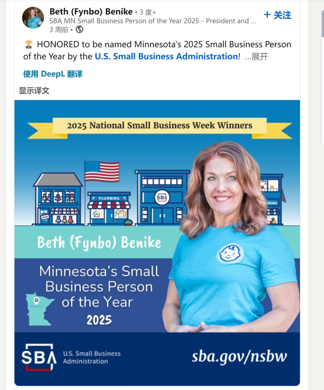 现在忙碌的宝贝官网上销售各种婴儿用品。在过去的六年里,贝丝告诉中新经纬,忙碌宝贝的利润总额为1500万美元(约1.1亿元人民币)。公司里有五名全职员工,两名兼职员工,包括她自己和和她一起经营公司的哥哥。就在两个星期前,她自己也得到了美国小企业管理局。(United States Small Business Administration)2025年明尼苏达州“年度小企业主”奖(SBA MN Small Business Person of the Year 2025)。