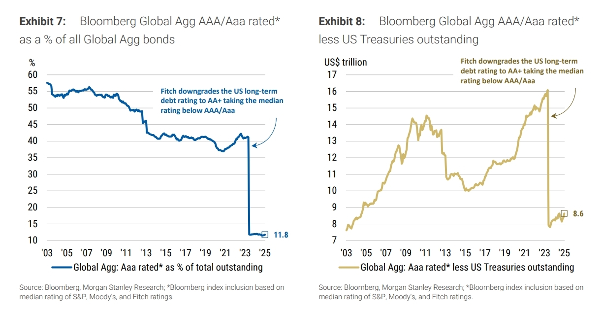 在全球彭博综合指数中,只有11.8%的债券被评为AA//Aaa。2023年8月,惠誉(Fitch)从AAA向AA下调美国长期债务评级 之后,这个比例急剧下降。
