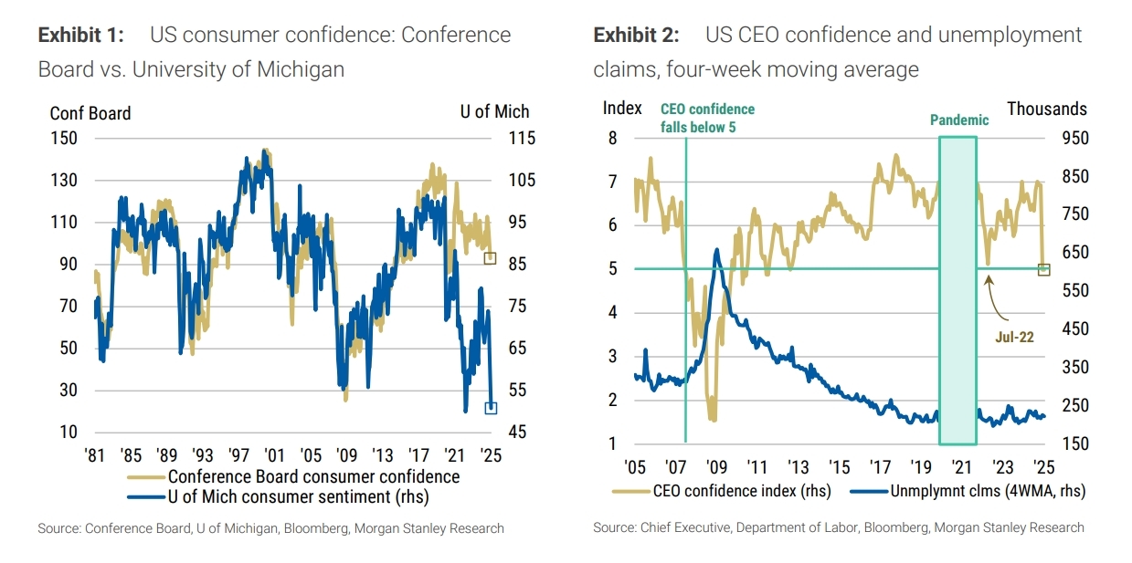 然而,根据摩根士丹利的分析,这一计划存在致命缺陷:货币政策和经济政策的效果远远落后于贸易政策变化的影响。4月2日之前,消费者信心出现裂痕,90天的暂停期不太可能带来太大的缓解。