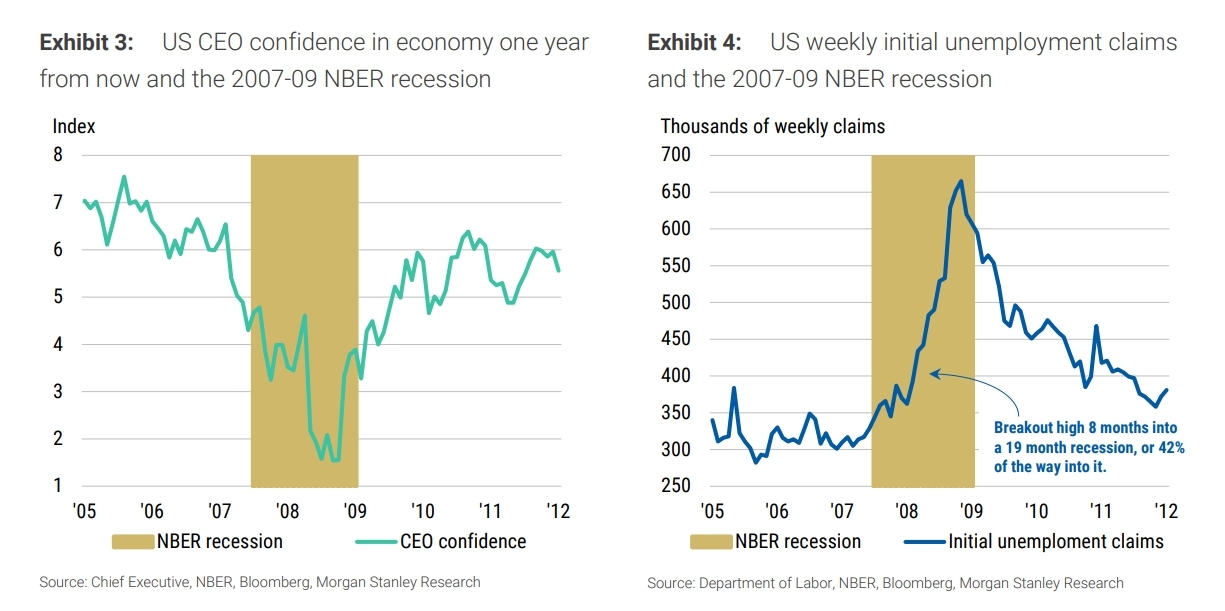 值得注意的是,当这三个月的净悲观和随后的衰退开始发生时,标准普尔500指数的价格从2007年10月9日的历史高点下降了最多10%。尽管首次申请失业救济的人数随着首席执行官乐观情绪的下降而增加,但索赔直到2008年7月才达到2005年10月的峰值以上——衰退开始后8个月,首席执行官在净悲观后11个月转为净悲观。