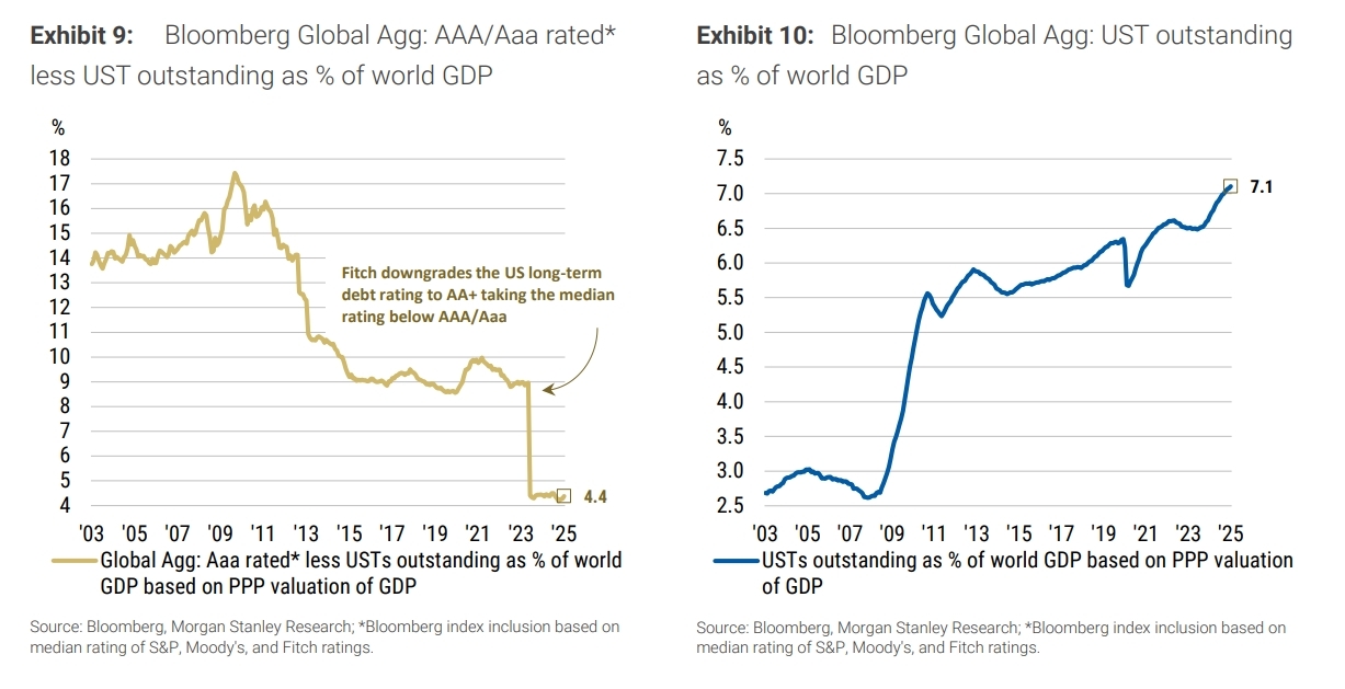 分析人士认为,如果宏观环境进一步恶化,导致美联储再次降息,投资者不必担心美国国债的供应。全球符合指数标准的美国国债 GDP 其中所占比例持续增长,这与 AAA/Aaa 评级债券状况形成鲜明对比。