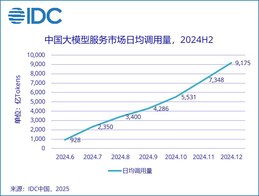 根据IDC调查数据,从2024年年中到2024年12月,中国公共云模型调用量从每月963亿Tokens飙升至每天9522亿Tokens——受DeepSeek影响,自2025年以来,中国公共云模型调用量实现了快速增长。