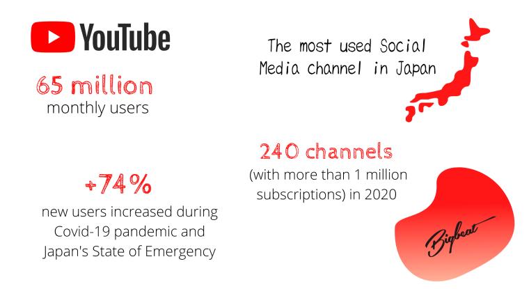 在社交媒体方面,与世界平均水平相比,日本以前处于较低的地位。根据东京营销公司Bigbeat的数据,日本人在疫情爆发前每天花在社交媒体上的平均时间只有51分钟,远低于全球平均2小时25分钟。疫情过后,日本YouTube 用户增强了 74%。