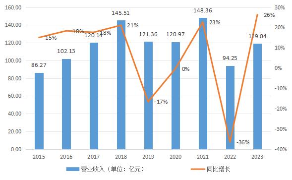 在收入增长方面,从2019年开始,分众传媒的营业收入有起有落,但总体趋势却在下降。与2018年阿里入股时的145.51亿元相比,2023年公司收入达到119.04亿元。