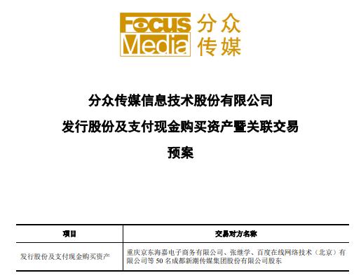 4月9日晚,分众传媒宣布,计划总价83亿元,购买张继学、重庆JD.COM、百度等50家交易对手持有的新潮传媒100%股权。以发行股票和现金结算收购对价。