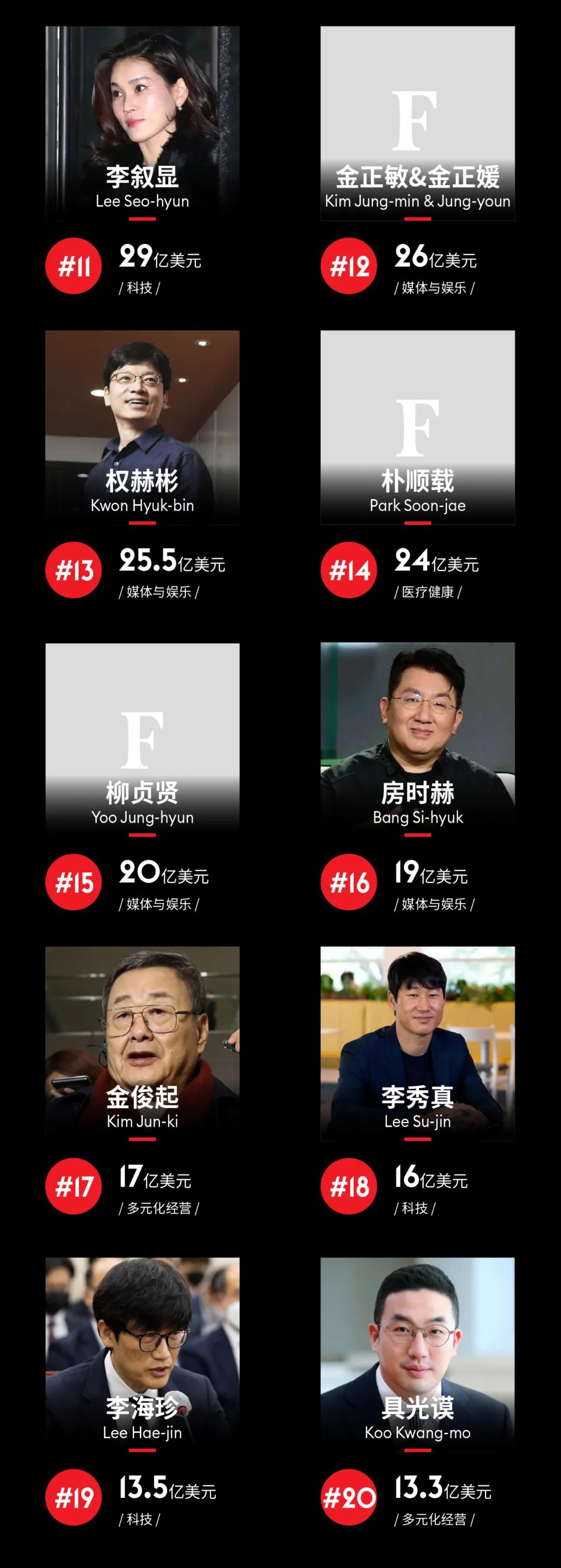 这个列表是基于从家庭和个人、证券交易所、年度报告、分析师、政府部门和其他渠道获得的职位和财务信息。富人的财富估值是根据截至2025年4月7日收盘时的股价和汇率来计算的,或许是福布斯官网。(Forbes.com)实时富豪榜数据有所不同。非上市公司的估值是基于与上市公司相似的交易数据。名单反映了个人财富和家庭财富,包括家庭互通的财富,所以可能不同于福布斯全球亿万富翁名单上的数据。后者的净资产数据截至3月7日。该名单还可能包括与韩国有业务、居住或其他相关的外国公民,或与该国有重要业务或其他相关的不生活在韩国的本国公民。根据新信息,编辑保留修改任何信息或删除任何上榜者的权利。