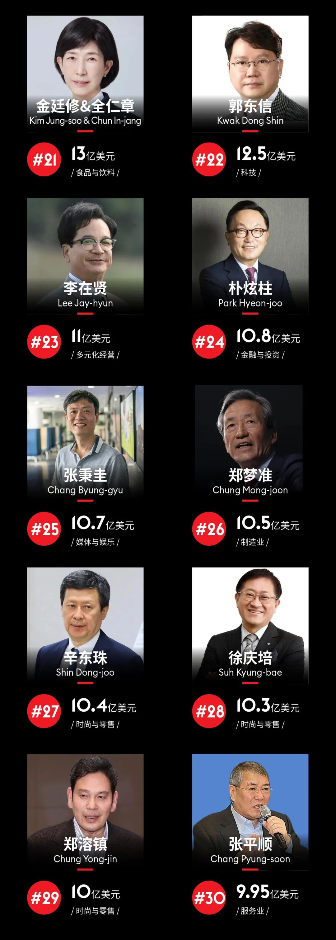 今年有三张新面孔上榜:三养食品(Samyang Foods)背后的夫妻档金廷修和全仁章,他们开发的麻辣火鸡面在海外畅销,他们的财富也在上升;网络游戏开发公司Shift 金亨泰,Up的创始人(Kim Hyung-tae),去年韩国第二大上市融资(融资金额3.2亿美元)完成后,他成为了一个富人。医疗美容设备公司Classys创始人郑成财(Jung Sung-jae),由于韩流美容热潮持续升温,该公司股价飙升50%。