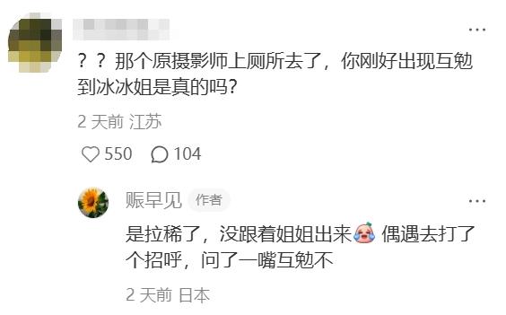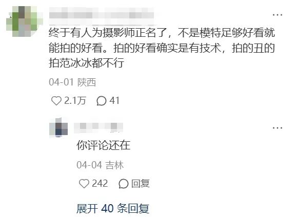摄影师说上次是第一次拍人像,然后很快弥补了人像知识,感谢范冰冰的鼓励。两次互相鼓励让围观者嫉妒,迅速制止他的评论:不要说他拍得不好,也不要让他再互相鼓励!