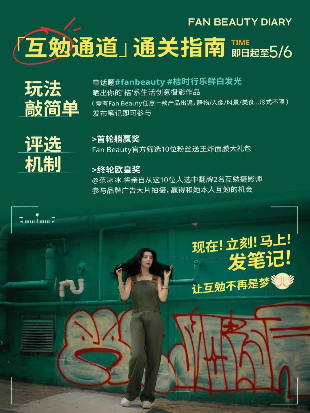 看每个人参与的热情,Fan Beauty 同时打开Diary「互勉通道」活动,在五月六日之前,只要带着话题和产品发布摄影图片,就有可能得到与范冰冰自己互相鼓励的机会。