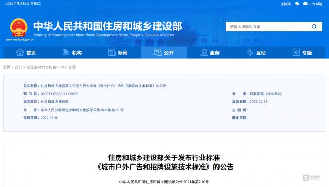 住房和城乡建设部《城市户外广告与招牌设施技术标准》