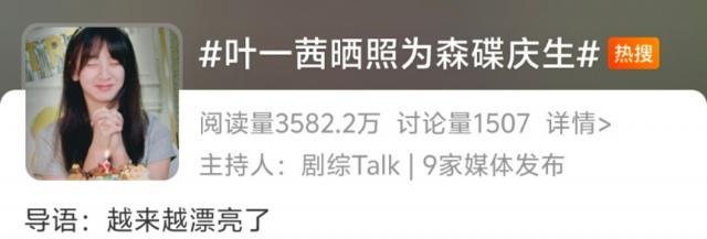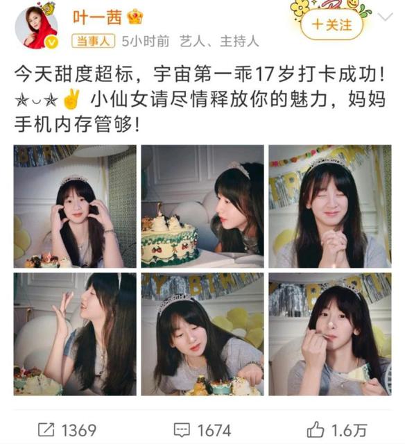 今日中午,叶一茜在微博帐号上分享了一组森碟图片,并配上文字,以庆祝闺女。 17 岁生日。