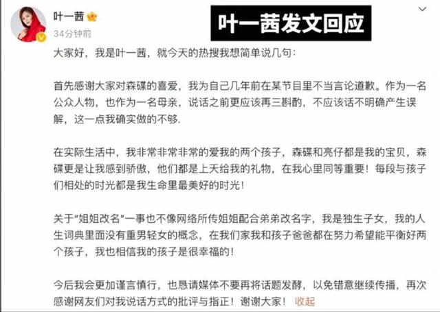 重男轻女的事情甚至上了热搜,叶一茜也发了一条信息回应。从文字中可以看出,她一直强调自己非常爱两个孩子,他们在自己心中同样重要;说话后会更加谨慎。