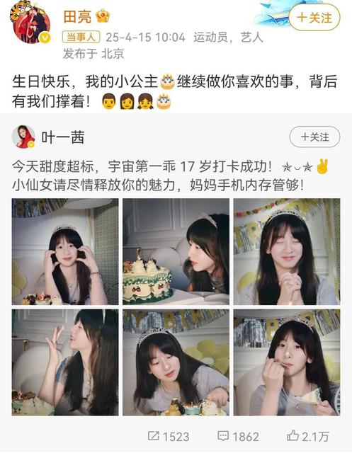 接着田亮转发了妻子的微博,并配文:“生日快乐,我的小公主继续做你喜欢的事情,背后有我们撑着!”