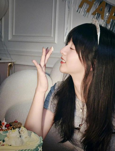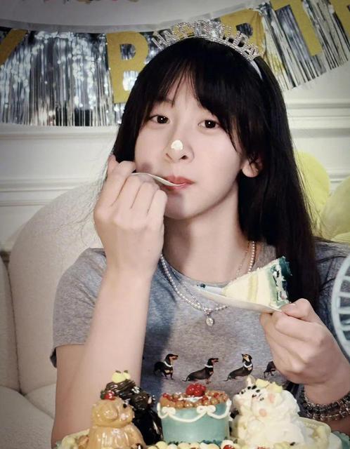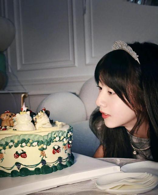 在生日照片中,森碟是浅灰色的。 T t恤搭配珍珠项链和皇冠发饰,温馨的生日场景,童趣的蛋糕造型,森碟或者调皮的吃蛋糕,或者用手沾一点蛋糕闻闻它的香味,或者握拳祈祷,或者在镜头前捏脸微笑。