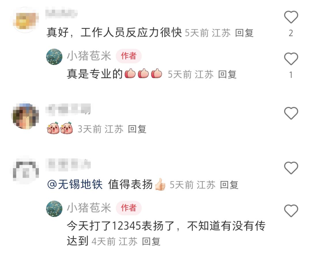 事件被徐女士发布到小红书后,迅速引起了大量网友的关注。在评论区,很多网友都在讲述无锡地铁的暖心故事,称赞地铁工作人员的专业素质和热心服务。