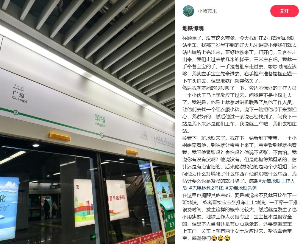 近日,网友“小猪苞米”在小红书平台发布笔记,记录了她与三岁儿童分别在地铁上的10分钟“惊心动魄”时刻,也讲述了无锡地铁员工高效专业的暖心故事。