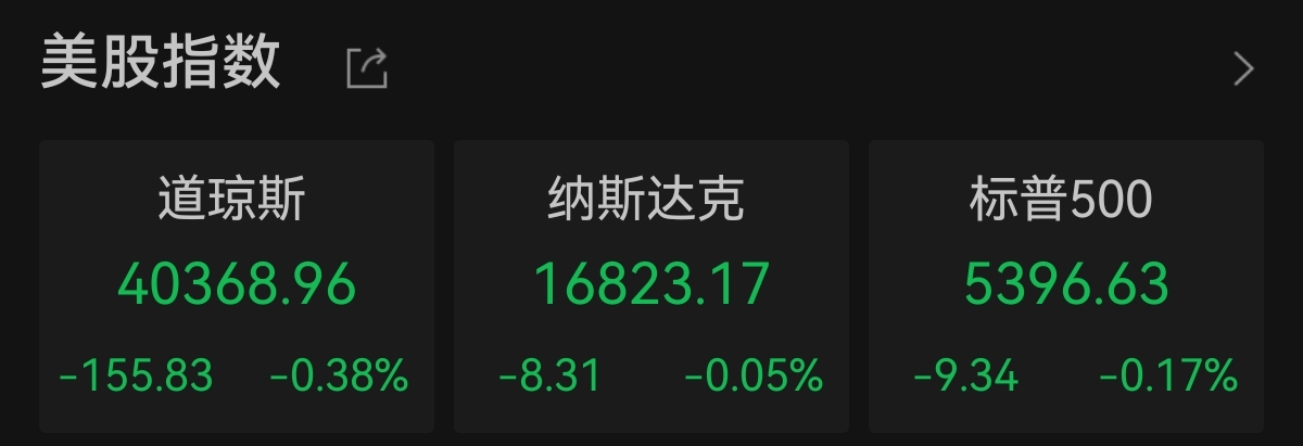美股三大指数周二小幅下跌。道琼斯工业指数下跌0.38%,报40368.96点;纳斯达克指数下跌0.05%,报16823.17点;标准普尔500指数下跌0.17%,报5396.63点。
