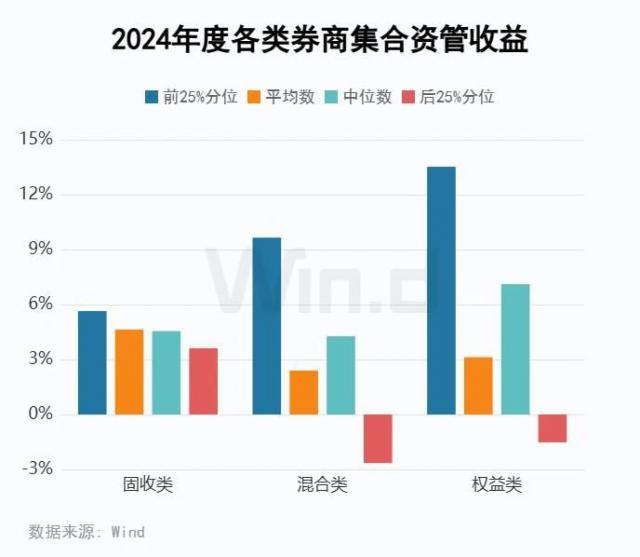 2024 年固定收益产品获得正中位数收益。 4.55%,前 25% 分位、后 25% 分位收益分别为 5.65%、3.61%。股权产品收益分化明显,收益中位数为 7.11%,前 25% 分位、后 25% 分位收益分别为 13.52%、-1.52% 。混合类产品收入中位数中位数 4.27%,前 25% 分位、后 25% 分位收益分别为 9.65%、-2.65%。
