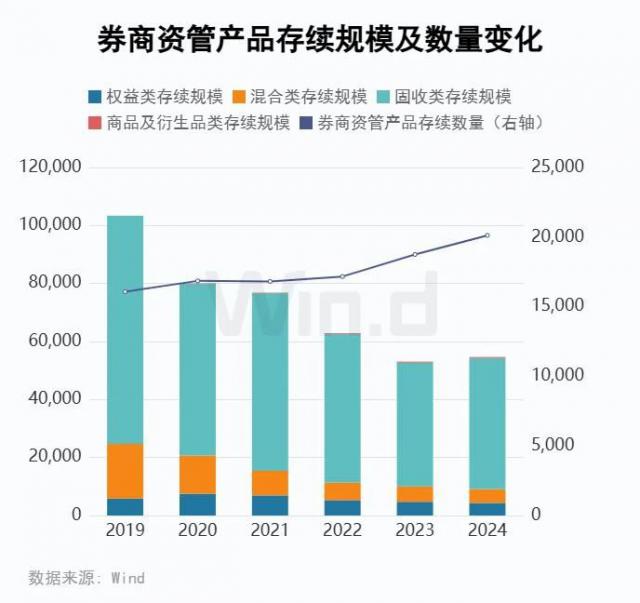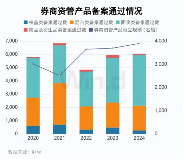 Wind 数据显示,截至 2024 年 12 月末,证券公司资产管理产品的最新存续规模为 54657 其中固收类产品规模为亿元。 45227 权益类产品规模亿元, 4343 混合类产品规模1亿元, 4755 亿元,商品及⾦融衍化品类产品规模 331 亿元。总规模同比增长 1611 其中,固收类产品的存续规模同比增长约1亿元。 6%。