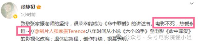 今年 2 月刚过了 45 张静初,平时在社交账号上晒日常学习生活。这几天,为了新电影《命中罪爱》,他很少积极“创业”,并表达了自己的态度:电影不朽,爱永恒。