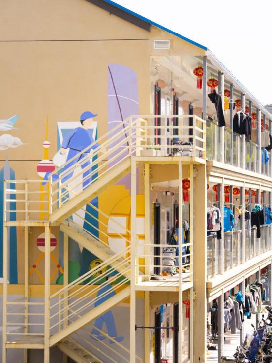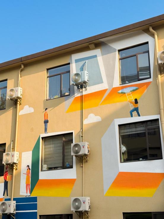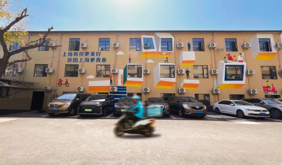 2024年4月,闵行区新虹街中航公寓“新时期城市建设者管理者家族”正式投入使用,由老厂房成长而成。其中,3号楼作为上海第一栋“骑手楼”,拥有100多名外卖骑手。墙绘采用裸眼3D艺术形式,目前在商业街区和文化地标流行,通过“三维景深”将传统建筑窗户转化为充满未来感的城市景观。