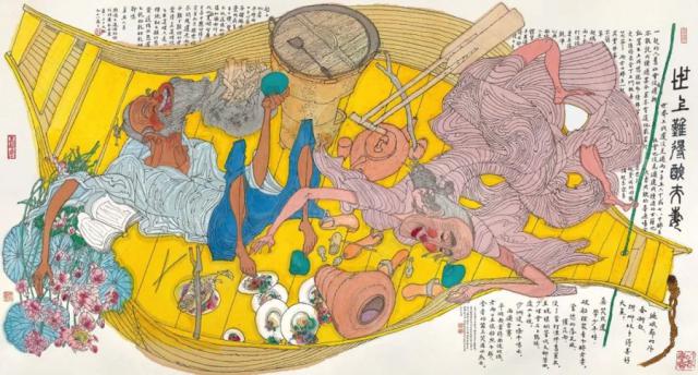 而且看看《宋元君到底想画什么图》,用荒谬的画笔解构艺术框架,总共画出了八位解衣盘宏伟的狂士和观众。它们呈“鱼咬尾”状构图,被视为仿佛 1940 重现了时代中华全国木刻协会的创作现场。在画笔的缝隙中,“塞”了三千多字的飘飘洒洒,多到可以单独写一篇精彩的文章。《煞风景》以幽默跋文与水墨相结合,借文人画雅趣与漫画式夸张,在自嘲中透露出对世界的透明豁达。
