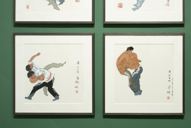 14 一组摔倒题材的作品,挂满了一整面墙,只有几笔,特别生动。准确抓住摔跤手的一招一式:推、披、穿腿、躺刀、反夹颈、单臂摔倒...策展方为这一系列作品取了一个生动的上海名字——“打相打”。这个词曾经让黄永玉印象深刻。"高尔基的小说《人间》包含了一段邻里女人的对话:‘我最喜欢看人打相打。"楼适夷先生用浙江方言翻译这段话,蕴含着浓浓的地方色彩,至今让我记忆犹新。“黄永玉曾经写过的这段记忆,出现在展品旁边的墙上,变成了有趣的“画外音”。