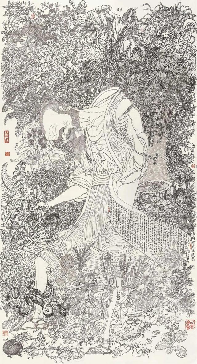 "老先生有些作品,好像是为了‘炫技’!好像在对大家说:‘看,我能画得这么精细,手就是不抖!"楼思岑笑着说。她所指的,是一批白描作品,画面被细如游丝般的线条覆盖,繁而不乱,颇具功底。例如,黄永玉创作于黄永玉 97 在《李时珍先生的想象》中,他不仅仔细描述了想象中的李时珍,还用墨线勾勒出了主角周围几十种植物、昆虫和药材。密集的场景题跋,是以蝇头小楷书为基础的近千字随想。99 岁月所画的《一枕万响围》,线条更加看得眼花缭乱。黄永玉这幅画需要时间 20 天完了,画的是一个人躺在荷塘里,听着雨打荷叶的“万响围”。灵感来自周敦颐的《夜雨书窗》,只是用荷叶代替了香蕉。在题跋中,他甚至不忘俏皮地炫耀:“小字不是炫耀字好,而是炫耀眼睛,否则你会试试吗?"