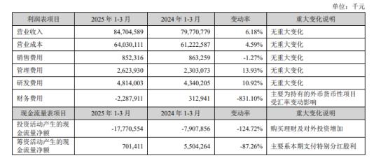 与毛利相比,净利润的增长率明显更高,主要原因是财务费用。财务报告显示,去年第一季度公司财务费用 3.13 亿元,大幅下降 831.10% 直到今年同期 -22.88 1亿元(相当于纯收入),在一定程度上带来了更多的利润。