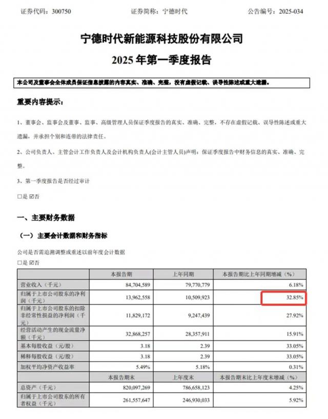 4 月 14 日本,宁德时代发布 2025 第一季度财务报告,第一季度总收入 847 亿元,同比增长 纯利润突破6.18% 139 亿元大关,同比增长30%以上,毛利率环比持续上升。