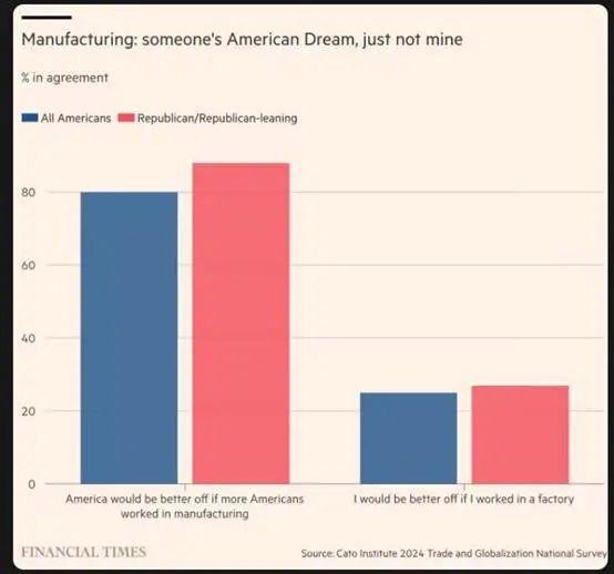 现实也是如此。研究所对美国人民的民意调查显示,虽然80%的美国人认为让美国人从事制造业对美国有好处,但只有20%的人愿意亲自去工厂做螺丝钉。