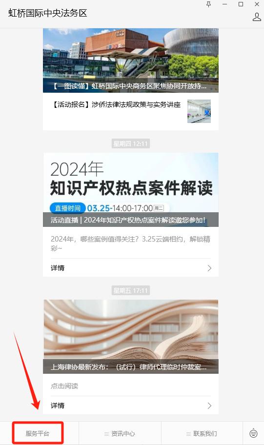 或关注【虹桥国际中央法务区】微信微信官方账号 进入下面的菜单栏。