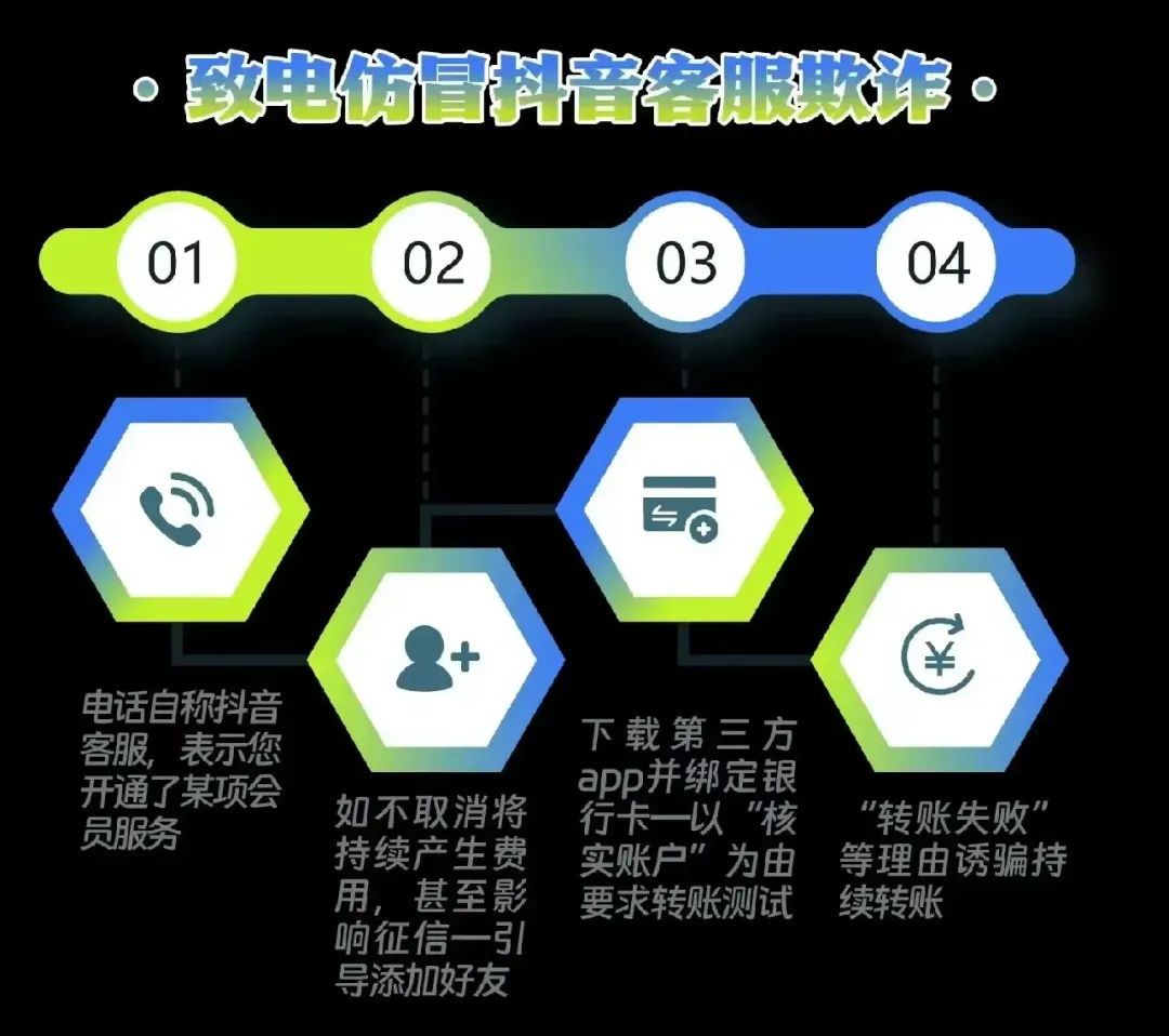 假冒身份:自称“抖音官方客户服务”,甚至伪造官方号码,骗取受害者信任。