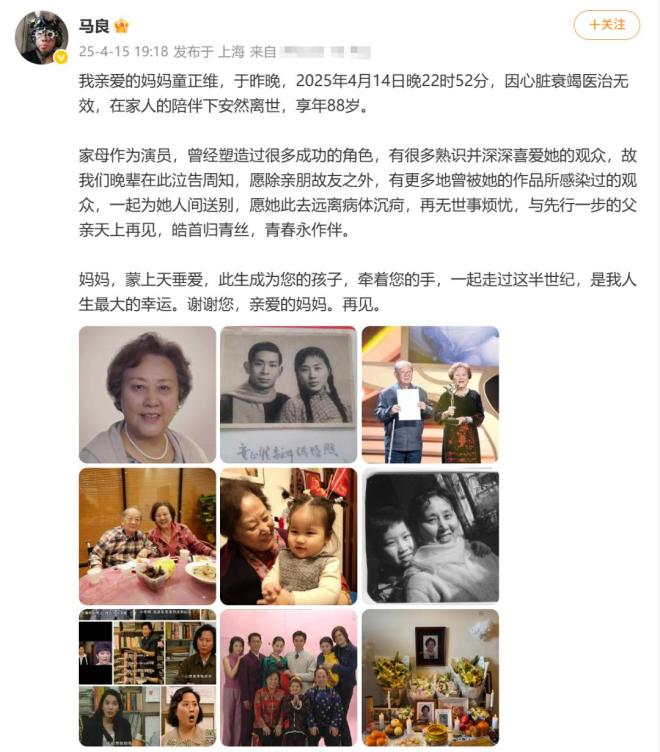 四月十五日,摄像师、作家马良透露,自己的母亲、演员童正维于四月十四日因心脏衰竭无效死亡,享年88岁。