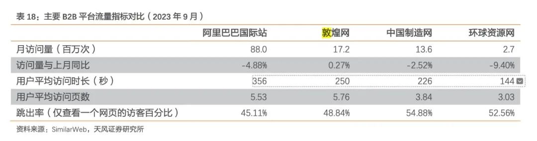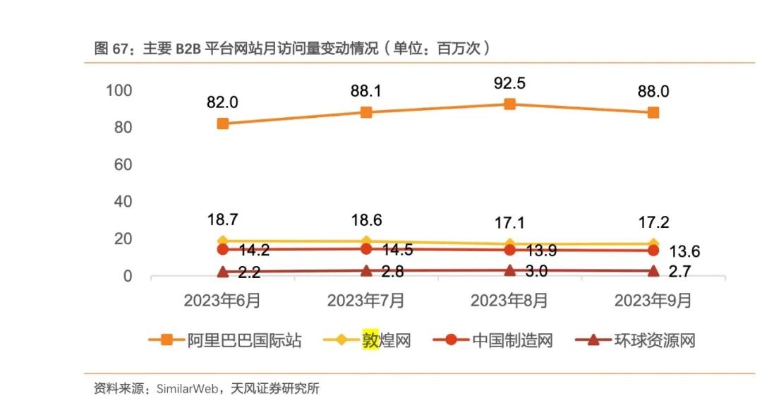 根据TF证券的统计,我国主要B2B平台网站的月浏览量也可以看出,阿里巴巴国际平均月浏览量保持在88%左右,而敦煌网只保持在18%,与中国制造网和全球资源网没有太大区别。