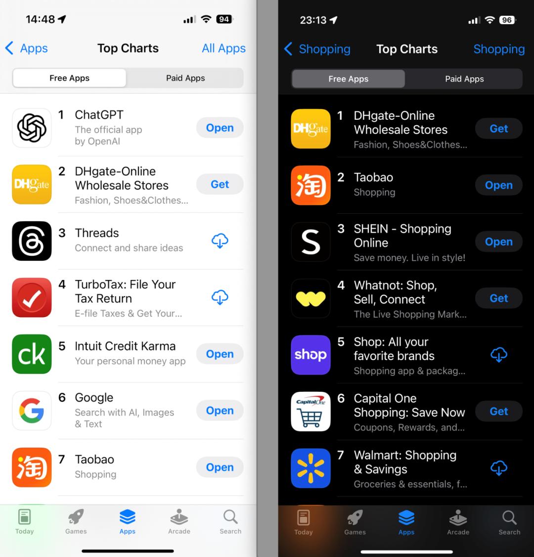 谁也没想到,这款中国跨境电商应用竟然能在两天内在美国下载近十倍,一路飙升至iOS应用商店美区免费应用排行榜第二,仅次于众所周知的ChatGPT。
