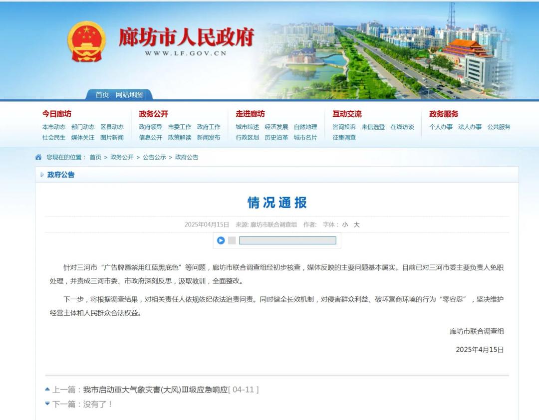 廊坊人民政府网站昨天(4月15日)正式发布通知:三河市委负责人免职,责令三河市委、市政府深刻反思,吸取教训,全面整改。。