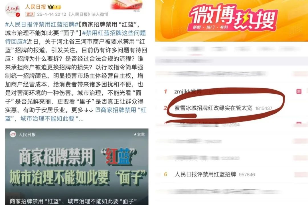 官方媒体也出手了,4月14日晚,人民日报发帖直接指出。"商家的招牌禁止‘红蓝’,城市治理不可能如此‘面子’"。
