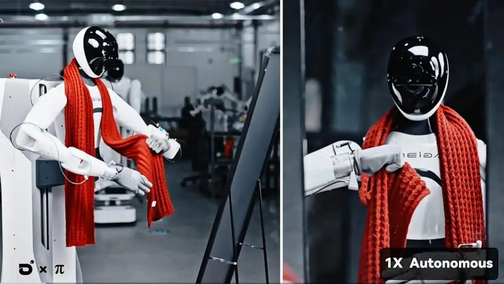 这一点可以通过目前各种人形机器人厂商为了担任长序列复杂任务技术的发展路线来看出。智源机器人与Pi的合作侧重于动态环境下长期复杂的任务技能,可以完成具有生物运动特点的围巾佩戴任务。首先观察镜中围巾和头部的位置,完成初始佩戴,然后根据两侧长度进行适当调整,实施“围”螺旋缠绕动作。