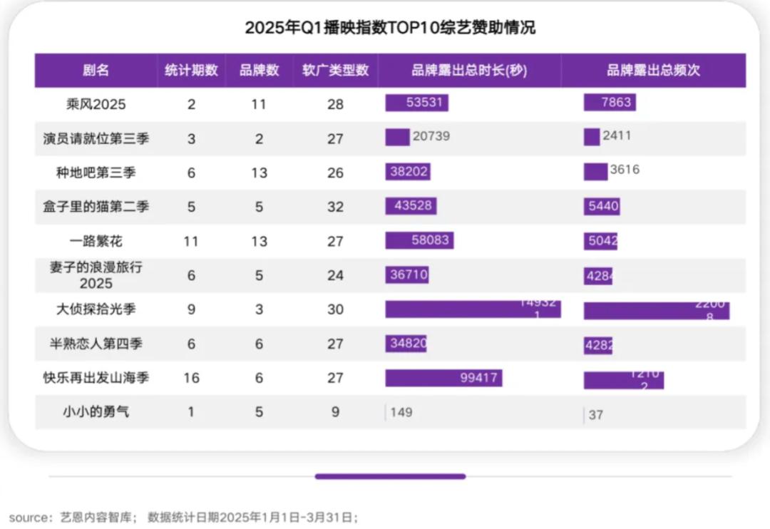 在新综艺节目中,《一路花》因其高话题性和1.7亿部全片的有效播放量而受到金主的青睐,赢得了13个品牌和27个软广类型,与《乘风2025》平分秋色。