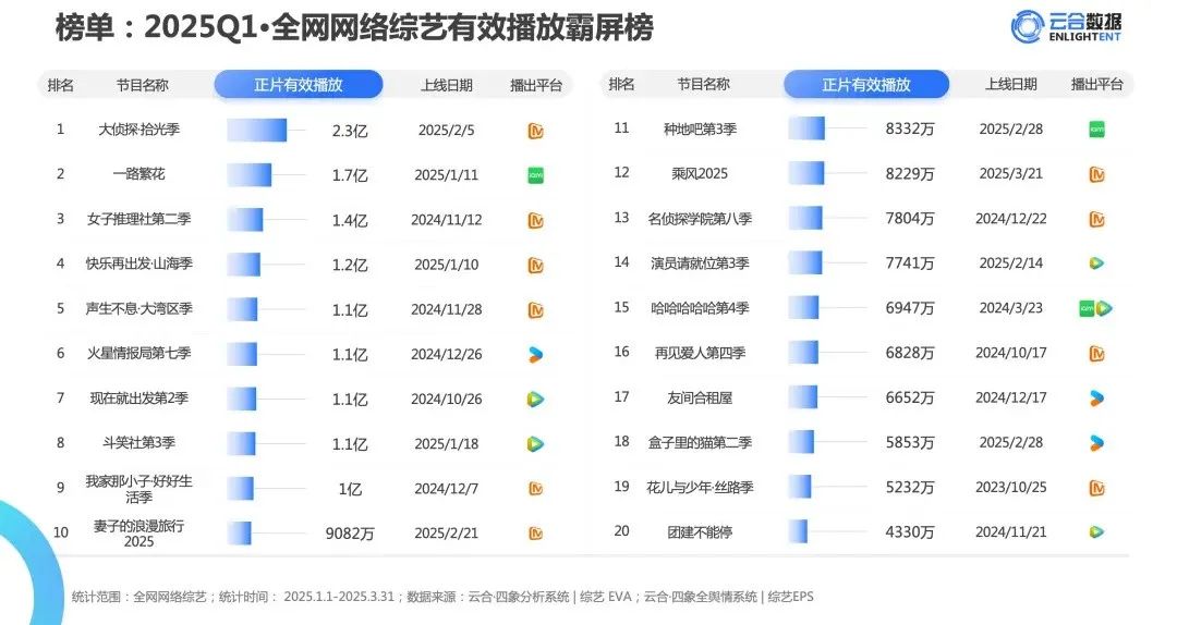 与去年同期相比,2025Q1综艺节目的新数量和总有效播放量略有增加,说明整体市场正在慢慢爬出往年的低谷,在核心数据上表现更加积极。