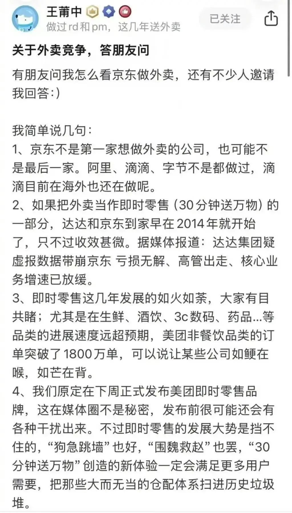 随后,美团核心地方商业CEO王莆中在社交平台上发布文件,犀利评价了JD.COM进入外卖市场,甚至使用了“狗跳墙”、修饰词,如“大而不当”。