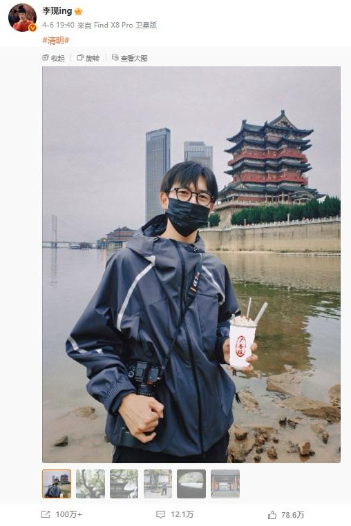△李现拿着奶茶,站在滕王阁前拍照。(图/@李现ing)