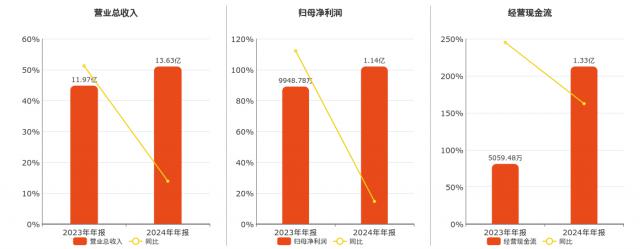 企业总营业收入为 13.63 亿元。归母净利润为 1.14 十亿元。经营活动现金净流入 1.33 亿元。