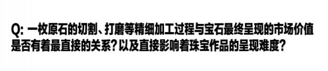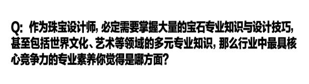 A: 第一,我觉得你的问题提得很好,提到了很多珠宝从业者需要具备的素养。宝石专业知识、设计技能等。这些都是我们从事这个行业必备的专业能力,但我认为最具核心竞争力的是至少在上述方面深挖的能力和对珠宝设计的热爱。珠宝销售是一个不适合赚快钱的行业。如果所有的行业信息都是泛泛而谈,那就谈不上核心竞争力了。如果你足够喜欢深挖,无论你在宝石专业知识还是世界珠宝艺术方面都做得很好,做到了极致,那么你的长板就是你的核心竞争优势。