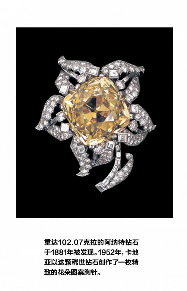 珠宝界,除了享受传奇色彩的蒂芙尼黄钻外,(The Tiffany Diamond)除此之外,还有一个同样引人注目的黄钻作品,那就是卡地亚的阿纳特裸钻。(The Annat Diamond)。由于其非凡的重量和独特的色彩,这颗钻石被称为世界。它的历史可以追溯到几个世纪前,当时钻石矿主要分布在印度和巴西。伴随着欧洲冒险家在世界范围内的航行,裸钻逐渐成为贵族和富人争相追逐的宝藏。发现和挖掘阿纳特钻石,意味着那个时代对财富和奢华的终极追求。这颗钻石的前所有者阿纳特少校,不仅是一位杰出的军人,更是一位热爱艺术和马术的著名艺术家。在 1950 年初,他把这颗珍贵的钻石交给了著名的珠宝品牌卡地亚。不久,卡地亚的工匠团队便以精湛的技艺,将这颗钻石精心地嵌在一枚精美的花朵图案胸针上。胸针的花瓣由不同切割的钻石组成,包括明亮、长阶梯、圆形和方形切割的钻石,充分展示了卡地亚优秀的技术和设计能力。