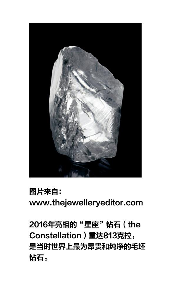 A :从我近 30 2008年珠宝事业中,缘分最深的宝石品类应该属于裸钻。我曾在出入境检验检疫机构和钻石交易市场工作,负责毛坯钻石的进出口控制,搭建交易平台提供裸钻供应链服务。在此期间,我还担任金伯利的国际联系人,在联合国框架下遏制矛盾钻石的进程,一般与全球裸钻行业联系在一起。2016 2000年,金伯利进程全体会议在迪拜举行。我和中国代表团一起参加了会议,有幸见证了当时世界上最昂贵、最纯净的裸钻。 The Constellation(名字意为“星座”)亮相。